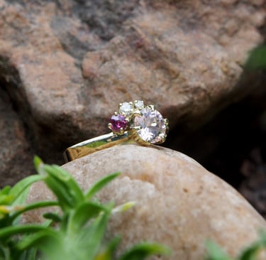 Prsten s morganitem, granátem a diamanty.