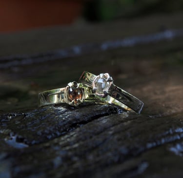 Mám rád nekonvenční snubní prsteny a jedny takové vám dnes chci představit. Ve zlatě tu máme zasazeny surové, nebroušené diamanty, s jejichž rozdílnými barvami koresponduje i rozdílná barva kovu. Dáma si přála bílé zlato, pan ženich žluté. Hlavy prstenů nechávají vyniknout nepravidelnému tvaru kamenů a jsou sice výrazné stylem, ale ne velikostí, aby nezanikl dojem snubních kroužků. Jejich mírně surový styl ladí se krásnou surovostí krystalů diamantu. Kéž přinesou novomanželům štěstí.